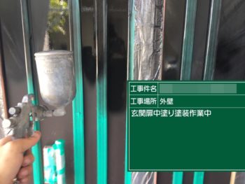 玄関ドア上塗り施工中