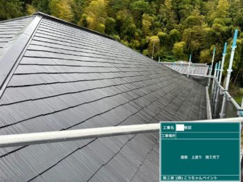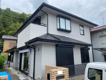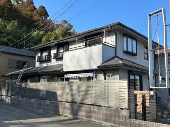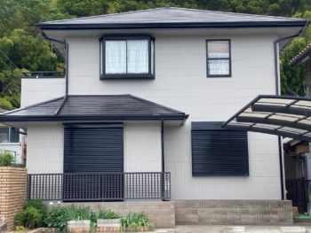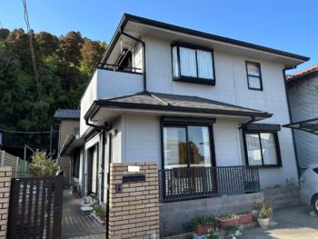 | お客様のご要望 | 外壁と屋根、雨樋に溜まる落ち葉対策の相談のためご来店いただきました。現地調査に伺い、気がかりなことなど お打合せをさせていただきました。塗膜の劣化から起こるチョーキング現象も見られ、コーキングの硬化も見られました。外壁塗装の際には、コーキング打ち替え、軒天や破風板、シャッターボックス、シャッター、水切りなど木部鉄部の塗装も併せて施工いたします。弊社で自信を持ってお勧めできる様々な種類の塗料の中からお選びいただいたのは“フッ素革命”と銘打たれたASTECのフッ素REVO1000IRです。フッ素含有量が豊富なので耐候性、低汚染性、遮熱性などお住まいを守る優れた特性を持ち耐久年数も長いです。お色はバーチグレーで落ち着いた雰囲気となりました。屋根はASTECスーパーシャネツサーモFという塗料でお色はブラックをお選びいただきました。美観性を際立たせるツヤ感や塗膜の感もおすすめポイントです。 |