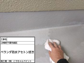 ベランダ防水アセトン拭き施工中