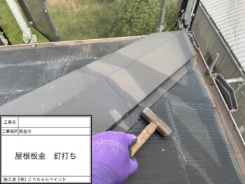 屋根板金釘打ち施工中