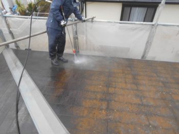 屋根高圧洗浄施工中