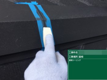 棟板金コーキング施工中