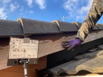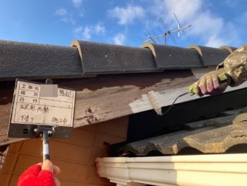 破風下塗り施工中
