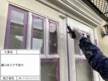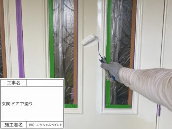 玄関ドア下塗り施工中
