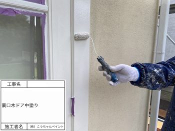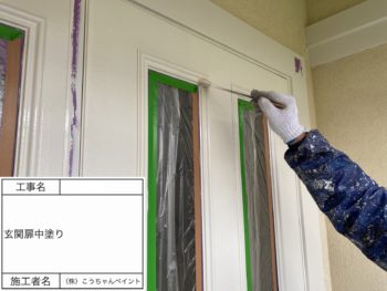 玄関ドア中塗り施工中