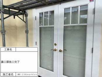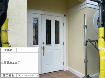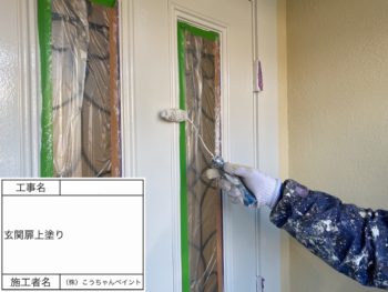 玄関ドア上塗り施工中