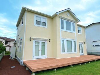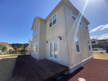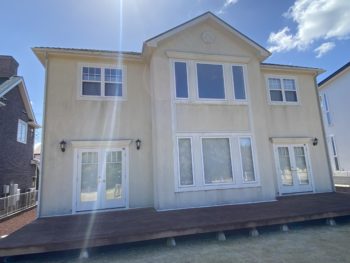大網白里市 K様邸 外壁とウッドデッキの汚れが気になるため、きれいにしておきたいとHP を見て「こうちゃんペイント」に依頼しました。外壁にあわせ窓枠、玄関、ガレージの扉の塗装もお願いしました。