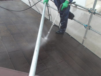 屋根の水洗いで汚れを隈なく落とします。