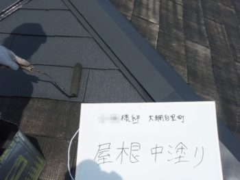 屋根、中塗り施工中。
