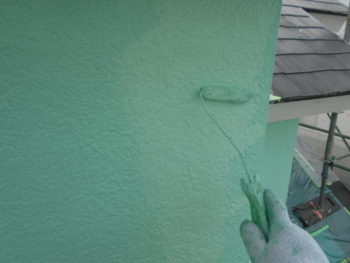 外壁上塗り塗装施工中。