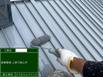 倉庫屋根上塗り施工中