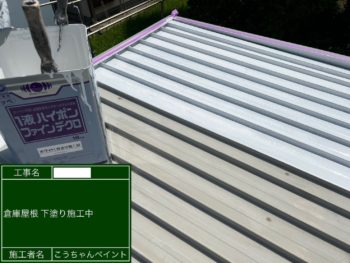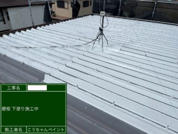 倉庫屋根下塗り施工中