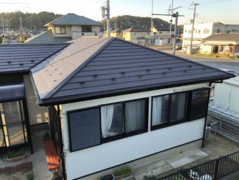 ガルバリウム鋼鈑を重ね葺きすることによって、ピカピカの屋根に生まれ変わりました。