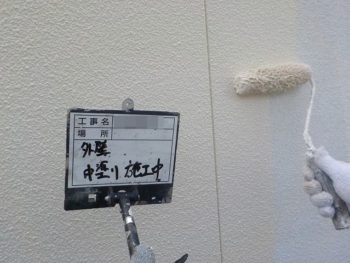 外壁中塗り施工中
