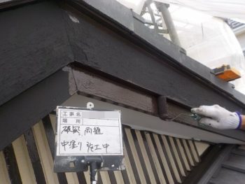 破風雨樋中塗り施工中