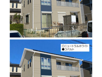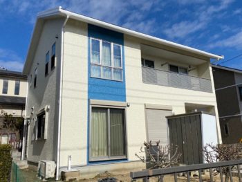 | 使用商材 | 外壁:ASTEC フッ素REVO1000-IR 色:ニュートラルホワイト・部分的エレクトリックブルー 屋根:ASTEC スーパー遮熱サーモSI 色:ミッドナイトブルー |