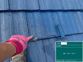屋根上塗り施工中