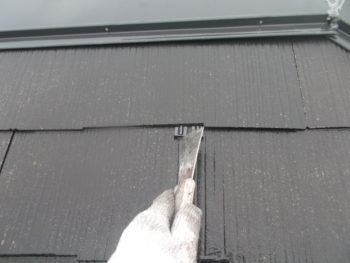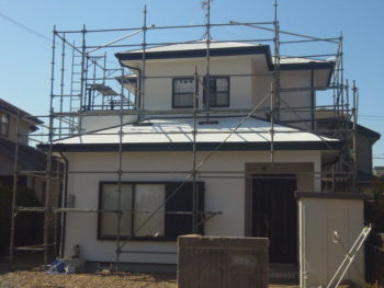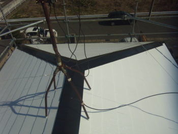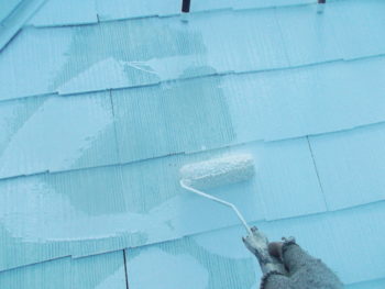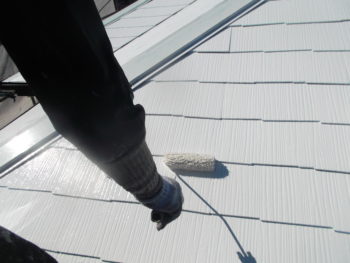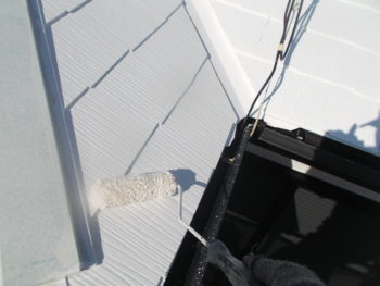 屋根の下塗り後、中塗り作業中