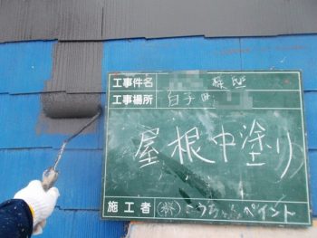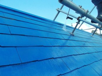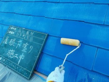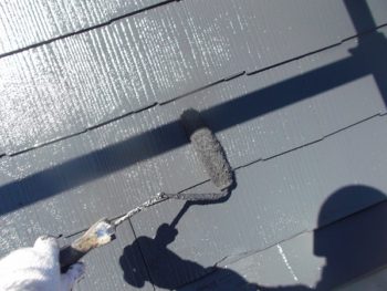 屋根、上塗り施工中です。