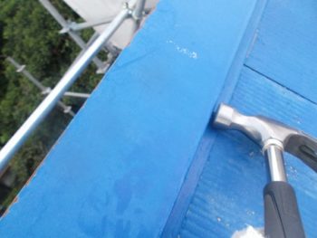 棟板金、釘打ち作業になります。