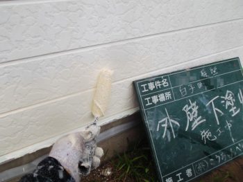 外壁、下塗り施工中です。